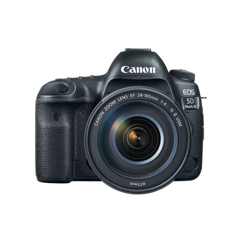 Kit reflex Canon comprenant le boîtier EOS 5D Mark IV et l’objectif 24-105 mm f/4L IS II USM, adapté à la photographie et à la capture vidéo 4K.